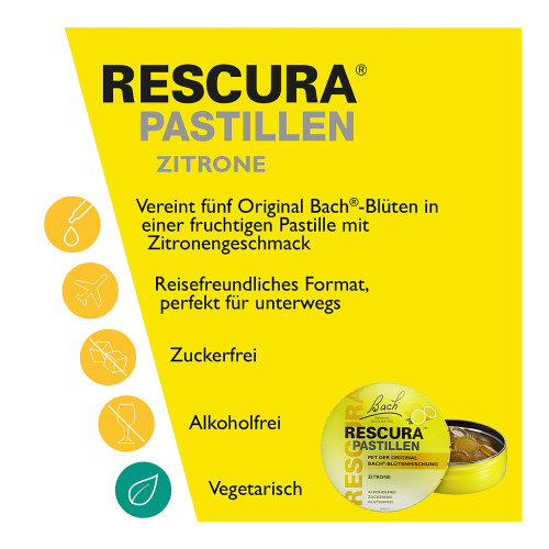 Bach RESCURA Pastillen enthalten die Original Bach®-Blütenmischung RESCURA. Sie eignen sich besonders für Kinder und sind ideal für unterwegs. Wohltuender Genuss in vielen anspruchsvollen Alltagssituationen, wie z.B. in der Schule. Bach RESCURA Pastillen sind alkohol- und zuckerfrei.