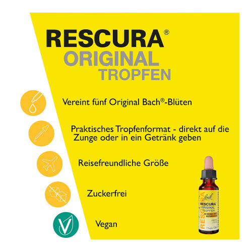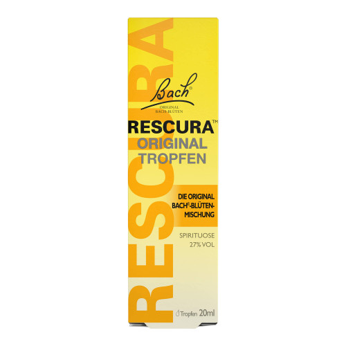 Die Original Bach RESCURA Mischung in der kultigen gelben Flasche unterstützt das emotionales Wohlbefinden und die innere Balance wenn Arbeit, Flugangst, Klausuren oder soziale Verpflichtungen überwältigend werden.