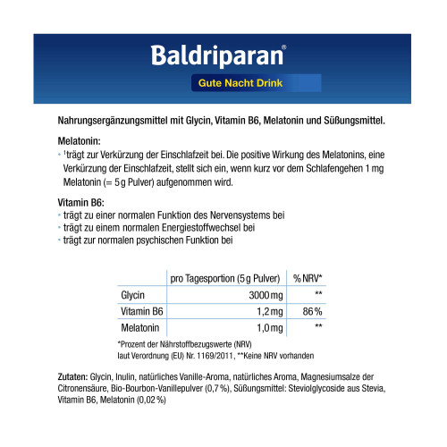Mit dem Gute Nacht Drink setzt Baldriparan® auf eine innovative Einschlafbegleitung mit echtem Wohlfühlmoment. Der Baldriparan Gute Nacht Drink unterstützt den Körper beim Einschlafen und ermöglicht dadurch eine erholsame Nacht. Die natürliche Vanillenote des Produkts lässt sich ganz individuell mit bestehenden Lieblingsgetränken kombinieren und schafft so eine milde Ergänzung, die sich warm oder kalt genießen lässt.