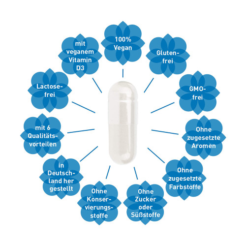 Magnesiumcitrat, Calciumlactat, Kaliumcitrat, Überzugsmittel (Kapselhülle: Hydroxypropylmethylcellulose), Kieselsäure, Magnesiumsalze der Speisefettsäuren, Zinkcitrat, Cholecalciferol (Vitamin D3).