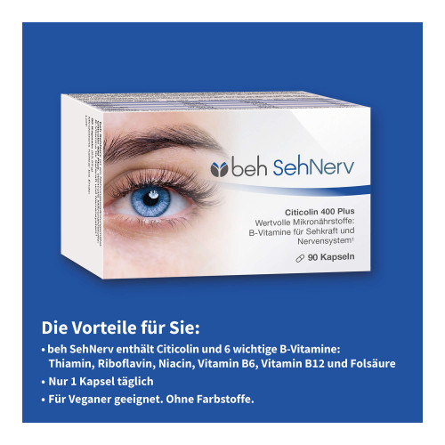 beh SehNerv enthält eine auf wissenschaftlichen Erkenntnissen beruhende Auswahl von Mikronährstoffen und ist speziell auf den erhöhten Mikronährstoffbedarf bei Sehkraft und Nerven abgestimmt. Hauptbestandteile sind Citicolin und sechs wichtige B-Vitamine.