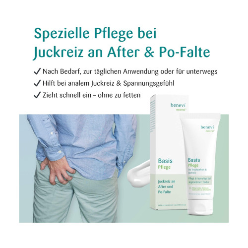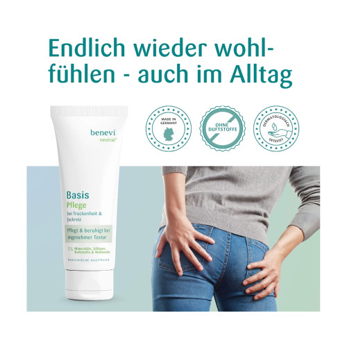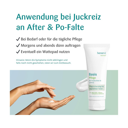 Die benevi neutral Basis Pflege wurde speziell für die tägliche Anwendung im empfindlichen Analbereich und der Po-Falte entwickelt. Sie eignet sich ideal zur Pflege bei durch Trockenheit, Reibung oder äußere Reize bedingtem Juckreiz sowie bei Neigung zu Analekzemen.