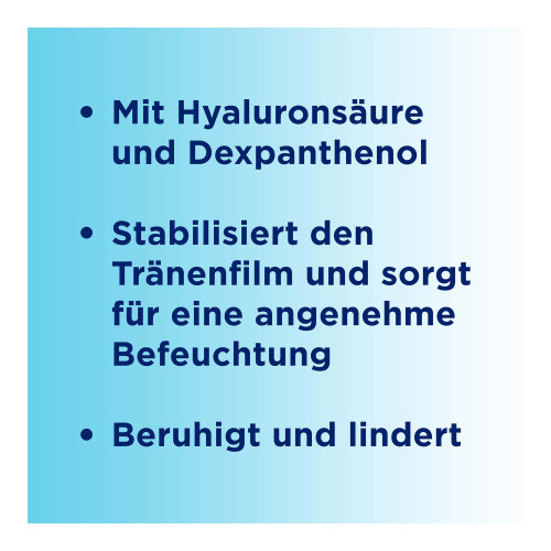 Die Kombination aus Natriumhyaluronat (Tränenfilm stabilisierend) und Dexpanthenol (pflegend, beruhigend) schützt und 4/11 befeuchtet die Augenoberfläche und macht sie gleitfähig. Dadurch bewirkt sie lang anhaltende Linderung bei Beschwerden in Zusammenhang mit
