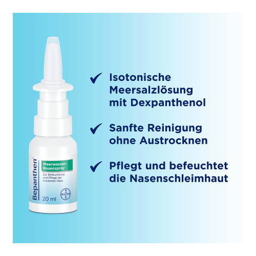Bepanthen® Meerwasser-Nasenspray ist eine wässrige Lösung zum Einsprühen in die Nase. Es wird angewendet zur Befeuchtung und Reinigung der Nasenschleimhaut, auch als Therapiebegleitung bei Erkältung oder Heuschnupfen. Außerdem bewahrt Bepanthen® Meerwasser-Nasenspray vor einer trockenen Nase, hervorgerufen durch trockene Luft in beheizten oder klimatisierten Räumen, Rauch oder Staub.