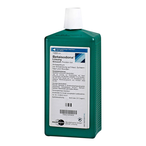 Betaisodona Lösung 100 mg/ml, Lösung zur Anwendung auf der Haut. Wirkstoff: Povidon-Iod. Anwendungsgebiet: Betaisodona® Lösung ist ein keimtötendes Mittel (Antiseptikum) zur Anwendung auf Haut, Schleimhaut und Wunden. Betaisodona® Lösung wird einmalig angewendet zur Desinfektion der intakten äußeren Haut oder Antiseptik der Schleimhaut wie z. B. vor Operationen, Biopsien, Injektionen, Punktionen, Blutentnahmen und Blasenkatheterisierungen. Betaisodona® Lösung wird wiederholt, zeitlich begrenzt angewendet zur antiseptischen Wundbehandlung (z. B. Druckgeschwüre, Unterschenkelgeschwüre), bei Verbrennungen, infizierten und superinfizierten Hauterkrankungen sowie zur chirurgischen Händedesinfektion.