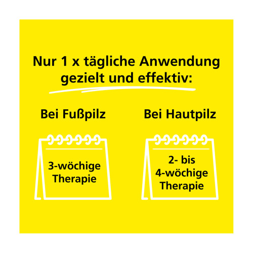 Die Anwendungsdauer richtet sich nach der Art der Beschwerden und/oder dem Verlauf der Erkrankung. Behandlungsdauer: bei Fußpilz und bei Pilzinfektionen zwischen den Zehen oder Fingern 3 Wochen, bei Pilzbefall der Haut und bei Pilzbefalll in Hautfalten mit Fadenpilzen 2-3 Wochen, bei Hautflechte durch Kleienpilz und Zwergflechte 2 Wochen, bei Pilzbefall der Haut mit Hefepilzen 2-4 Wochen.