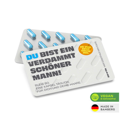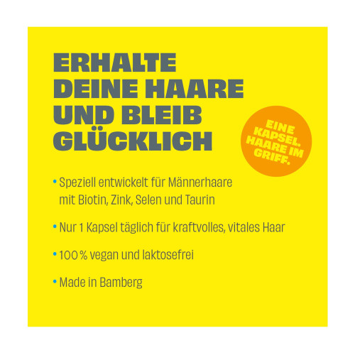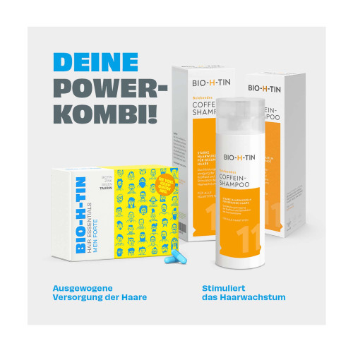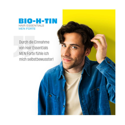 BIO-H-TIN Hair Essentials Men forte wurde von Bamberger Experten speziell für die Bedürfnisse von Männerhaaren entwickelt. Die innovative Formulierung mit Biotin, Zink und Selen trägt zur Erhaltung normaler Haare bei. Der zusätzliche Inhaltsstoff Taurin mach die Formel komplett. Mit nur einer Kapsel täglich unterstützt du die Versorgung deiner Haare mit wichtigen Mikronährstoffen – für mehr Vitalität und ein selbstbewusstes Auftreten.