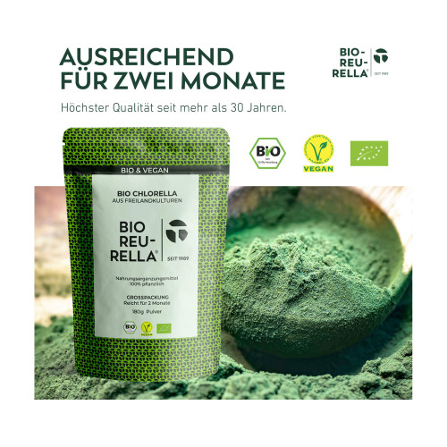 BETA REU-RELLA besteht zu 100% aus biozertifizierter Chlorella Pyrenoidosa.