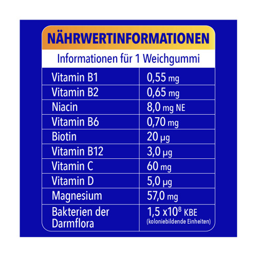 Glukosesirup; Zucker; Magnesiumcitrat; Wasser; Vitamin C (L-Ascorbinsäure); Geliermittel: Pektin; Maltodextrin; Niacin (Nicotinamid); Säureregulatoren: Natriumascorbat, Trinatriumcitrat; Bakterienstamm Bacillus coagulans SNZ 1969; Natürliches Orangenaroma; Modifizierte Stärke; Vitamin B6 (Pyridoxinhydrochlorid); Vitamin B2 (Riboflavin); Vitamin B1 (Thiaminhydrochlorid); Stabilisator: Gummi arabicum; Sonnenblumenöl; Farbstoff: Paprikaextrakt; Biotin (D-Biotin); Überzugsmittel: Carnaubawachs; Vitamin D (Cholecalciferol); Vitamin B12 (Cyanocobalamin).