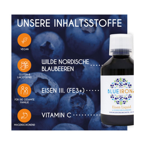 BlueIron Eisen Liquid ist das ideale Eisenpräparat für alle, die unter Müdigkeit, Konzentrationsproblemen oder Erschöpfung leiden. Mit seiner innovativen Formel aus mikroverkapseltem Fe3+ Eisen und hochwertigen Vitaminen liefert es genau das, was dein Körper braucht – gut verträglich, angenehm im Geschmack und stark in der Wirkung.