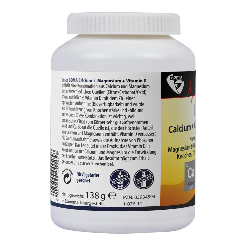 BOMA Calcium + Magnesium + Vitamin D enthält eine Kombination aus Calcium und Magnesium aus unterschiedlichen Quellen (Citrat/Carbonat/Oxid) sowie natürliches Vitamin D mit dem Ziel einer optimalen Aufnahme (Bioverfügbarkeit) und wurde zur Unterstützung von Knochenstärke und -bildung entwickelt. Diese Kombination ist wichtig, weil organisches Citrat vom Körper sehr gut aufgenommen wird und Carbonat die Quelle ist, die den höchsten Anteil von Calcium und Magnesium enthält. Vitamin D hilft bei der Calcium- und Phosphoraufnahme im Körper. Das bedeutet in der Praxis, dass Vitamin D in Kombination mit Calcium und Magnesium die Entwicklung der Knochen unterstützt. Das Resultat trägt zum Erhalt gesunder und starker Knochen bei.