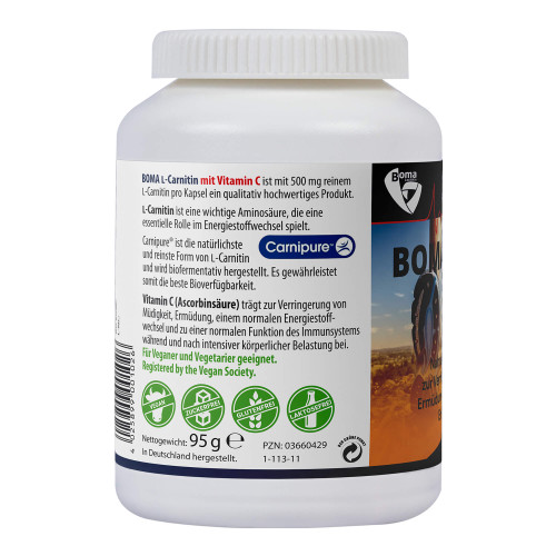 L-Carnitin von BOMA Lecithin enthält 500 mg reines L-Carnitin pro Kapsel, welches aus Carnipure® gewonnen wird. Carnipure® ist die natürlichste und reinste Form von L-Carnitin und wird biofermentativ hergestellt. Es gewährleistet somit höchste Reinheit und die beste Bioverfügbarkeit. L-Carnitin von BOMA Lecithin ist rein vegan und auch von der Vegan Society ausgezeichnet. Zusätzlich enthält es Vitamin C zur Unterstützung des Energiestoffwechsels und dem Schutz der Zellen vor oxidativem Stress. Zudem trägt Vitamin C zur Verringerung von Müdigkeit und Ermüdung bei und dient einer normalen Funktion des Immunsystems während und nach intensiver, körperlicher Betätigung.