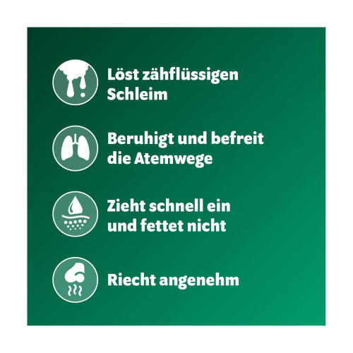 Die Inhaltsstoffe entstammen mehreren Pflanzen und wirken als natürliches Gemisch. Die Inhaltsstoffe bewirken im Anwendungsgebiet eine vermehrte Durchblutung und eine Schleimlösung. Eucalyptusöl regt zudem die feinen Härchen der oberen Atemwege zu schnelleren Bewegungen an. Dadurch kann festsitzender Schleim besser abtransportiert und das Abhusten erleichtert werden. Es vermindert außerdem den Hustenkrampf.