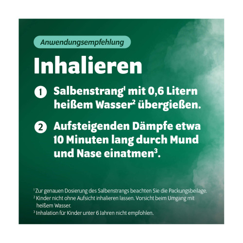 Zur Inhalation 2- bis 4-mal täglich für Erwachsene und Jugendliche ab 12 Jahren einen 3-5 cm langen Salbenstrang, für Kinder von 6 bis 12 Jahren einen 1-3 cm langen Salbenstrang mit 0,6 Litern heißem Wasser übergießen und die aufsteigenden Dämpfe etwa 10 Minuten lang durch Mund und Nase einatmen (Vorsicht, anfangs sind die Dämpfe heiß!).