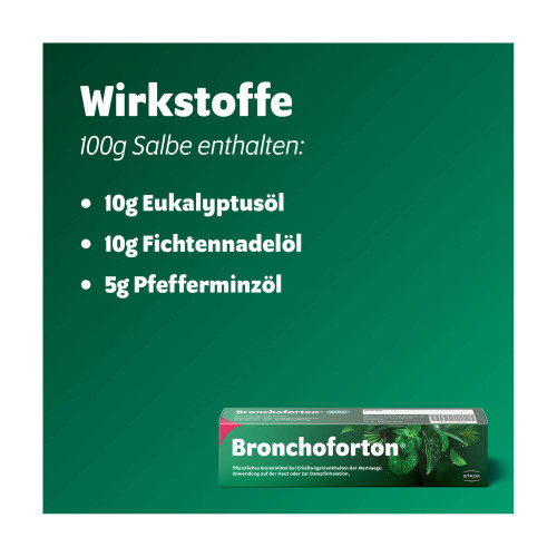 Bronchoforton Salbe 10 %/10 %/5 %. Anwendungsgebiete: Zur Anwendung bei Kindern ab 4 Jahren und Erwachsenen. Zur Inhalation und äußerlichen Anwendung zur Besserung der Beschwerden bei Erkältungskrankheiten der Atemwege mit zähflüssigem Schleim. Warnhinweis: Enthält Stearylalkohol.