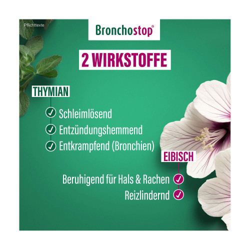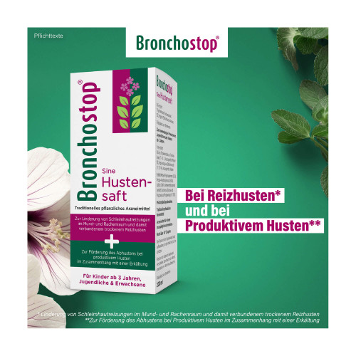 BRONCHOSTOP ® Sine Hustensaft ist ein traditionelles pflanzliches Arzneimittel angewendet zur Linderung von Schleimhautreizungen im Mund- und Rachenraum und damit verbundenem trockenem Reizhusten sowie zur Förderung des Abhustens bei produktivem Husten im Zusammenhang mit einer Erkältung.