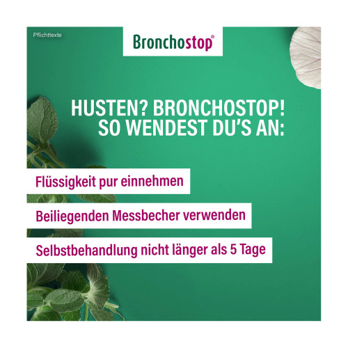 Die Selbstbehandlung mit BRONCHOSTOP® Sine Hustensaft sollte auf 5 Tage begrenzt sein.