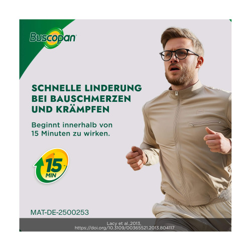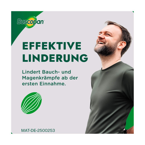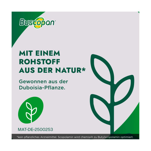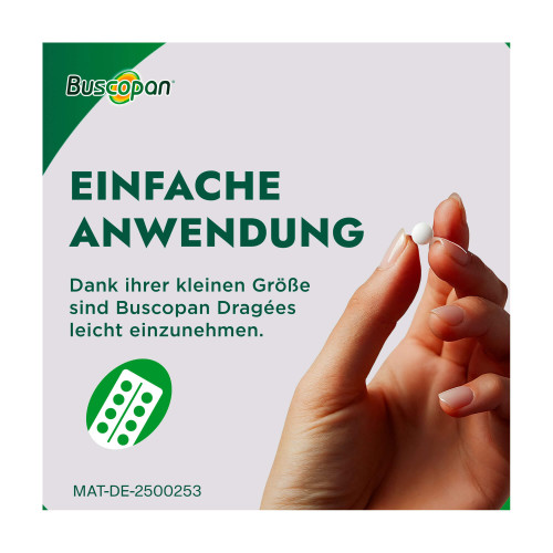 Buscopan® Dragées 10 mg Überzogene Tablette. Wirkstoff: Butylscopolaminiumbromid. Anwendungsgebiete: Zur Behandlung von leichten bis mäßig starken Krämpfen des Magen-Darm-Traktes, sowie zur Behandlung krampfartiger Bauchschmerzen beim Reizdarmsyndrom. Warnhinweis: Enthält Sucrose (Zucker).
