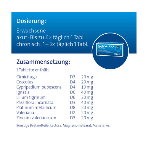 Calmvalera Hevert Tabletten. Anwendungsgebiete: Die Anwendungsgebiete leiten sich von den homöopathischen Arzneimittelbildern ab. Dazu gehören: Nervös bedingte Unruhezustände und Schlafstörungen. Warnhinweis: Enthält Lactose.