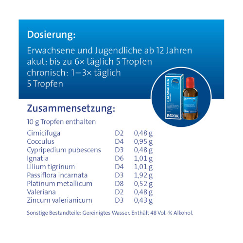 Calmvalera Hevert Tropfen, Mischung. Anwendungsgebiete: Die Anwendungsgebiete leiten sich von den homöopathischen Arzneimittelbildern ab. Dazu gehören: Nervöse Störungen wie Schlafstörungen und Unruhe, Verstimmungszustände. Warnhinweis: Enthält 48 Vol.-% Alkohol.