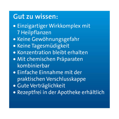 Dieses Arzneimittel enthält 12 mg Alkohol (Ethanol) pro 1 Tropfen (48 Vol.-%). Die Menge in 5 Tropfen dieses Arzneimittels entspricht weniger als 2 ml Bier oder 1 ml Wein. Die geringe Alkoholmenge in diesem Arzneimittel hat keine wahrnehmbaren Auswirkungen.