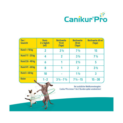 Verwenden Sie Canikur®Pro so lange, wie es als notwendig erachtet wird oder vom Tierarzt empfohlen wurde, aber nicht länger als 4 Wochen. Während einer Antibiotika-Behandlung verwenden Sie Canikur®Pro begleitend bis sieben Tage nach Beendigung der Antibiotika-Therapie. In Fällen mit akutem Durchfall sollte Canikur®Pro gegeben werden bis der Durchfall aufhört und ein paar Tage darüber hinaus. Wenn sich das Allgemeinbefinden Ihres Tieres erschlechtert und/oder der Durchfall sich innerhalb von 48 Stunden nach Start mit Canikur®Pro nicht bessert, suchen Sie umgehend einen Tierarzt auf. Bei chronischem Durchfall sollten Sie immer Ihren Tierarzt aufsuchen.