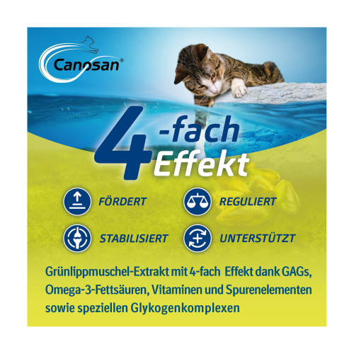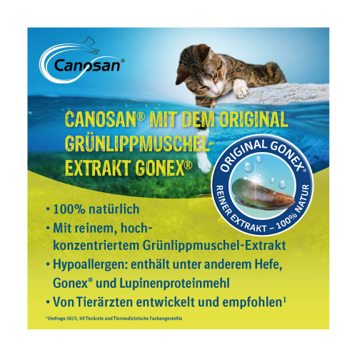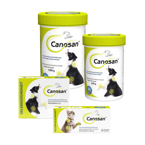 Canosan® ist ein natürliches Ergänzungsfuttermittel für beide Tierarten, Katzen und Hunde, das mit großem Forschungsaufwand speziell für die Regulierung und Stabilisierung für deren Bindegewebsstrukturen entwickelt wurde. Canosan® für Hunde gibt es in den Darreichungsformen Pellets (PZN 08594140) und Kautabletten (PZN 01745423).