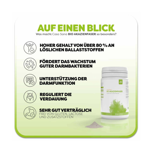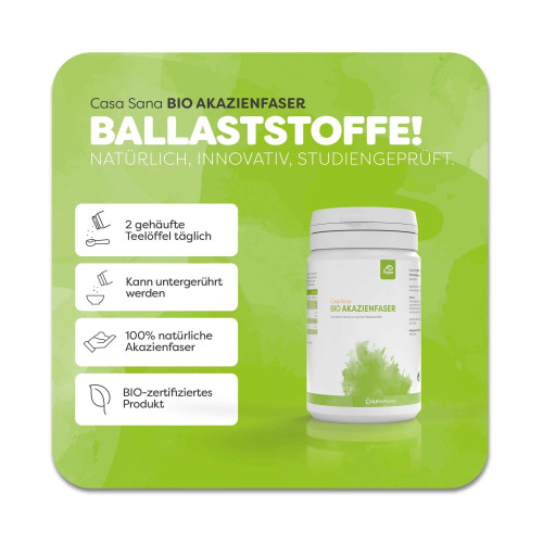 Casa Sana BIO AKAZIENFASER ist ein hochwertiges Ballaststoffpräparat in Apothekenqualität. Es findet Anwendung zur Unterstützung der Darmfunktion für die Verdauungsregulierung. Die enthaltenen wertvollen Ballaststoffe tragen zu einer normalen Funktion der Darmtätigkeit bei*. Des Weiteren dienen Ballaststoffe den guten Darmbakterien wie Bifido- und Lactobakterien als Nahrungsquelle. Dadurch kann sich Casa Sana BIO AKAZIENFASER auch als sinnvolle Ergänzung während der Einnahme eines Probiotikums eignen. Zusätzlich können die enthaltenen Ballaststoffe ein längeres Sättigungsgefühl fördern. Das präbiotische Pulver zeichnet sich durch einen hohen Gehalt von über 80 % an wertvollen löslichen Ballaststoffen aus. Das Präparat besteht zu 100 % aus Akazienfaser, die aus kontrolliertem biologischem Anbau gewonnen wird. Im Gegensatz zu anderen Ballaststoffen, wie bspw. Flohsamenschalen, ist Casa Sana BIO AKAZIENFASER nicht-quellend, sodass es keiner erhöhten Trinkmenge bei der Einnahme bedarf und das Präparat weniger aufblähend ist. Das BIO-Produkt ist geschmacksneutral, gut löslich, vegan sowie gluten- und laktosefrei. Hergestellt ohne Zusatzstoffe, Konservierungsmittel & Geschmacksverstärker. Casa Sana BIO AKAZIENFASER wurde entwickelt und geprüft unter wissenschaftlicher Kontrolle und wird Personen ab dem 3. Lebensjahr empfohlen.