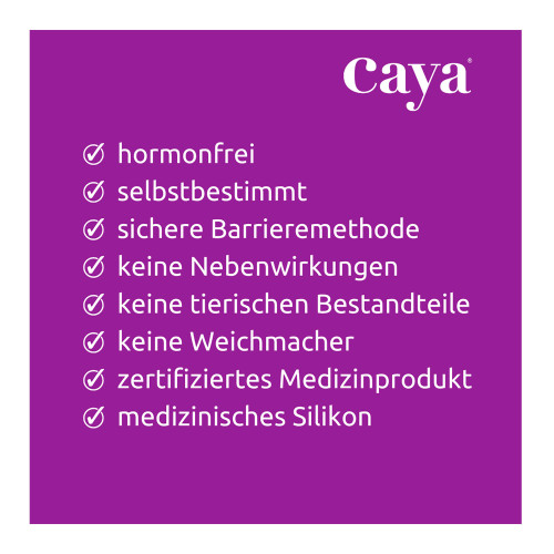Das Caya® wird vor dem Geschlechtsverkehr in die Scheide eingeführt. Es bedeckt den Muttermund vollständig und liegt zwischen dem hinteren Scheidengewölbe und der Nische am Schambein. Beim und nach dem Geschlechtsverkehr verhindert das Caya® das Eindringen von Spermien in die Gebärmutter. Nach dem Verkehr muss das Caya® Diaphragma mindestens 6 Stunden in der Scheide verbleiben.