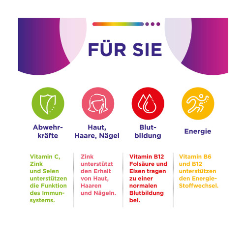 Der menschliche Körper ist ein biologisches Meisterwerk in dem hochkomplexe Prozesse ablaufen für die Mikronährstoffe in ausreichender Menge benötigt werden. Die Centrum Frauen-Nährstoff-Formel Für Sie enthält alle lebensnotwendigen Vitamine sowie wichtige Mineralstoffe und Spurenelemente. Die Formulierung ist speziell auf die Bedürfnisse von Frauen abgestimmt – zur optimalen Ergänzung Ihrer täglichen Ernährung. Mit nur einer Tablette pro Tag decken Sie den Tagesbedarf vieler Vitamine. Das Ergebnis: Der Körper wird durch die mit Sorgfalt zusammengestellte Nährstoffformel ganzheitlich unterstützt.