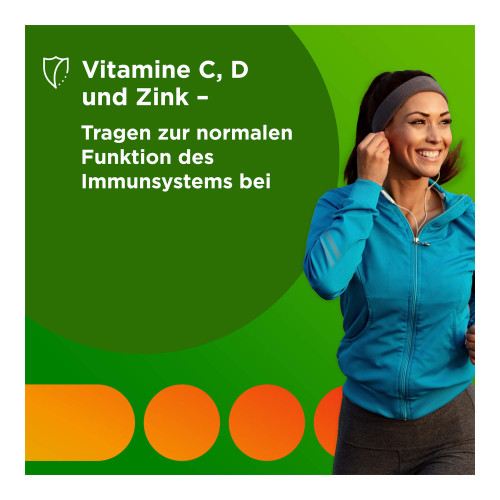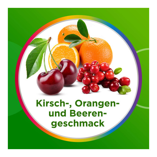 Glukosesirup; Zucker; Gelatine; L-Ascorbinsäure; Wasser; Säuerungsmittel: Citronensäure; Nicotinamid; DL-alpha-Tocopherylacetat; Zinksulfat; natürliche Aromen 0,25 % (natürliches Orangenaroma, natürliches Kirschenaroma mit weiteren natürlichen Aromen, natürliches Erdbeeraroma); färbende Lebensmittelkonzentrate 0,22 % (Karotte, Schwarze Johannisbeere); pflanzliche Öle (Kokos-, Rapsöl); färbende Lebensmittelkonzentrate <0,1 % (Roter Rettich, Färberdistel, Schwarze Karotte, Kirsche); Pyridoxinhydrochlorid; Retinylacetat; Überzugsmittel: Carnaubawachs, Bienenwachs; Kaliumiodid; D-Biotin; Cholecalciferol; Cyanocobalamin.