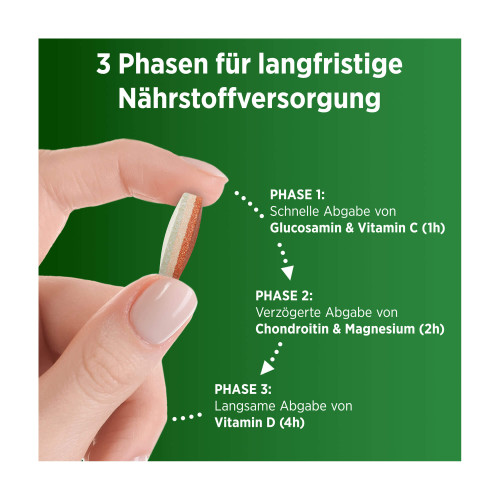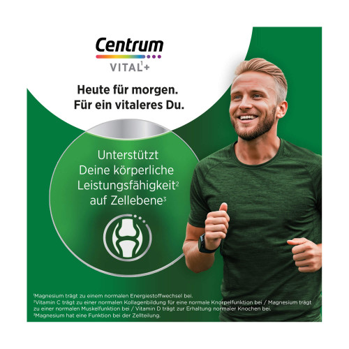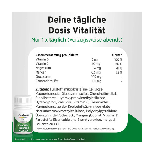 Centrum Vital1+ Knochen, Knorpel & Muskeln2 bietet einen hochwertigen 3-Phasen Nährstoffkomplex für körperliche Leistungsfähigkeit2 und Zellregeneration3. Im Alter verändert sich unser Bewegungsapparat, wodurch Knochen, Muskeln und Gelenke beeinträchtigt werden können. Damit der Körper während dieser Veränderungen optimal versorgt wird, benötigt er spezifische Nährstoffe. Hier kann Centrum Vital1+ Knochen, Knorpel & Muskeln2 als wertvolle Ergänzung dienen. Die darin enthaltenen Mikronährstoffe tragen zur Unterstützung wichtiger Funktionen des Bewegungsapparates bei. Der Nährstoffkomplex enthält Glucosamin und Chondroitin, welche natürliche Bestandteile des Knorpelgewebes sind. Hinzu kommen Vitamin C, das zur normalen Kollagenbildung für eine normale Funktion von Knorpel beiträgt, und Vitamin D, welches zur Erhaltung normaler Knochen beiträgt. Das enthaltene Magnesium trägt zudem zu einer normalen Muskelfunktion bei. Die 3-Phasen-Technologie setzt die Nährstoffe in drei Phasen frei und sorgt dadurch für eine optimierte Nährstoffaufnahme. Der Schlüssel für körperliche Vitalität liegt in den Zellen. Deshalb unterstützt Centrum Vital1+ Knochen, Knorpel & Muskeln2 während der nächtlichen Regenerationsphase auch die Zellerneuerung. Magnesium spielt dabei eine wichtige Rolle, da es eine Funktion bei der Zellteilung hat und somit den Zellstoffwechsel unterstützt. Die Einnahme von Centrum Vital1+ Knochen, Knorpel & Muskeln2 ist einfach und komfortabel. Die Filmtabletten sind ummantelt und daher leicht zu schlucken.