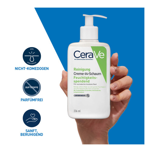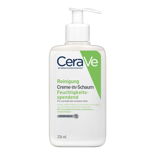 Die feuchtigkeitsspendende Creme-zu-Schaum Reinigung von CeraVe ist eine Reinigungscreme für normale bis trockene Haut. Die Creme reinigt sanft, entfernt Make-up und spendet Feuchtigkeit, ohne die Hautschutzbarriere anzugreifen. Die milde Gesichtsreinigung verwandelt sich beim Auftragen auf die Haut in einen weichen Schaum, der wirksam Verunreinigungen und Make-up entfernt – ohne der Haut die natürliche Feuchtigkeit zu entziehen. Die Formel ist mit Hyaluronsäure, Aminosäuren und Ceramiden angereichert. Diese Inhaltsstoffe versorgen trockene Haut intensiv mit Feuchtigkeit. Die CeraVe Gesichtsreinigung für empfindliche Haut wurde zusammen mit Dermatologen entwickelt.