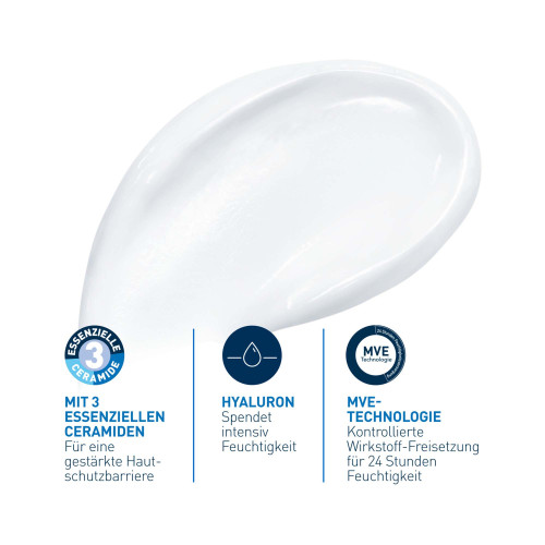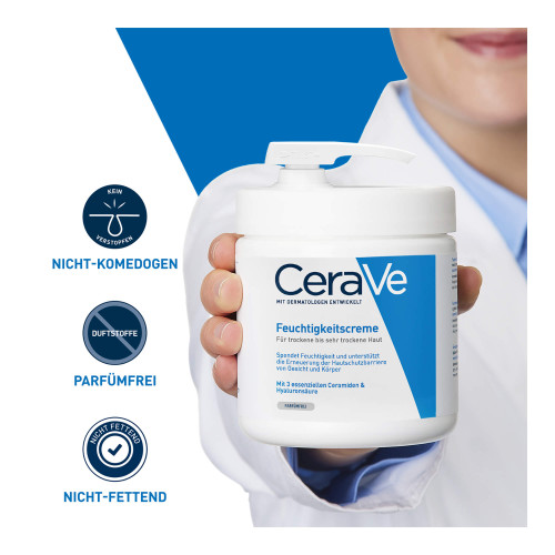 Die CeraVe Feuchtigkeitscreme für Gesicht und Körper hydratisiert die Haut, beugt Austrocknung vor und stärkt die Hautschutzbarriere. CeraVe Feuchtigkeitscreme für trockene bis sehr trockene Haut Die Hautpflege zeichnet sich durch ihre patentierte MVE-Wirkstoff-Freisetzung aus, die die aktiven Wirkstoffe über den Tag verteilt an die Haut freigibt. Dank Hyaluron und drei essenziellen Ceramiden wird die Haut kontinuierlich mit Feuchtigkeit versorgt und die natürliche Hautschutzbarriere gestärkt – für ein angenehm weiches Hautgefühl. Die CeraVe Feuchtigkeitscreme enthält keine Dufstoffe und eignet sich auch bei zu Neurodermitis neigende Haut und für Allergiker.