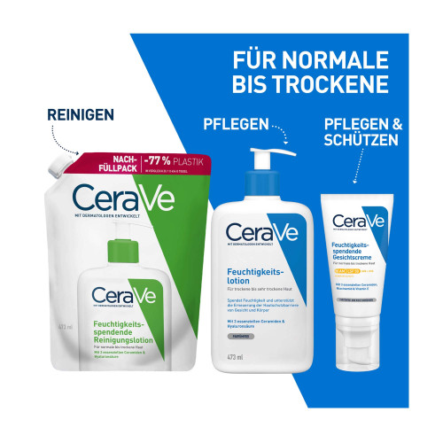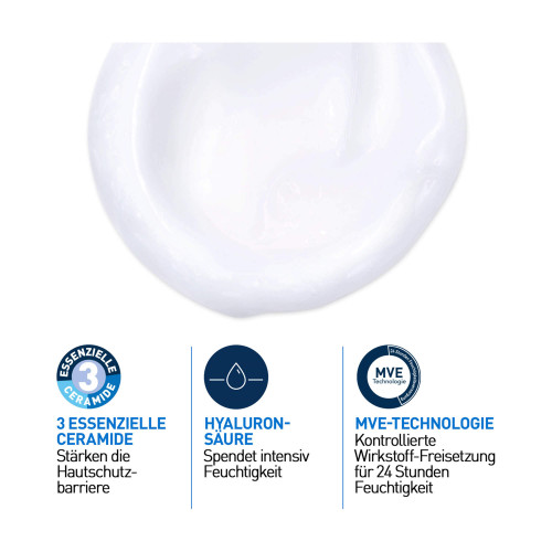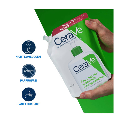 Die CeraVe Feuchtigkeitsspendende Reinigungslotion mit Hyaluron, den drei essenziellen Ceramiden 1, 3 und 6-II und Glycerin reinigt schonend, fördert den Erhalt der natürlichen Hautschutzbarriere und erhöht die Hautfeuchtigkeit ab der ersten Anwendung. Dank der MVE-Technologie werden die Aktiv-Wirkstoffe schrittweise freigesetzt und wirken so besonders lange. Die sanfte CeraVe Reinigungscreme schäumt nicht, ist nicht-komedogen und verzichtet auf Dufstoffe – auch ideal für Kinderhaut und Allergiker geeignet.