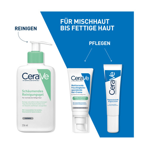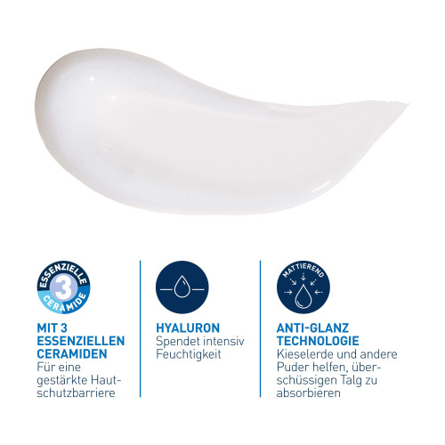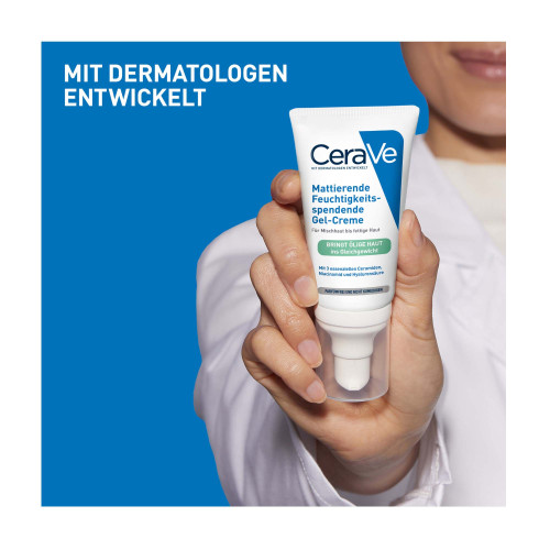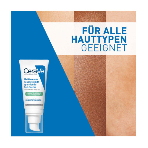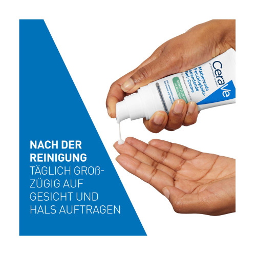 Die mattierende Gel-Creme von CeraVe versorgt insbesondere fettige und ölige Haut den ganzen Tag mit Feuchtigkeit. Zusätzlich stärken 3 essenzielle Ceramide die natürliche Hautschutzbarriere, während Niacinamid und Siliziumdioxid die Talgproduktion regulieren und Hautglanz mattieren. Die leichte Textur der hydratisierenden Gel-Creme ist mit Hyaluronsäure angereichert, die Feuchtigkeit in größeren Mengen Wasser bindet und dank der MVE-Technologie (MultiVesicular Emulsion Technology) den Tag über kontinuierlich freigesetzt wird – für ein frisches Hautgefühl, 24 Stunden lang.