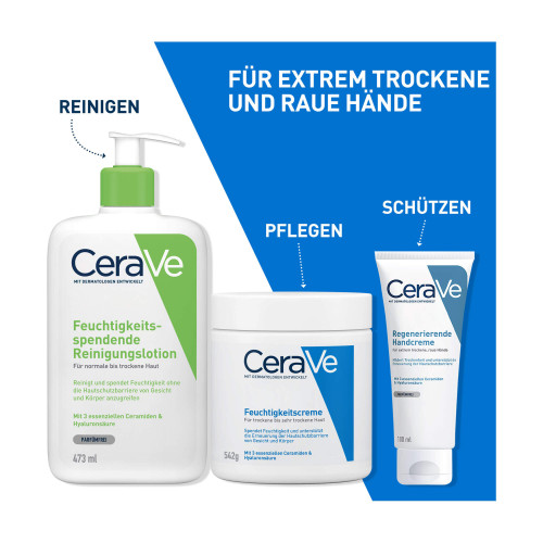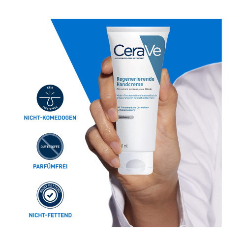 Die CeraVe Regenerierende Handcreme aus der Tube entnehmen und großzügig auf die Hände auftragen. Anschließend sanft einmassieren. Dank ihrer leichten Formulierung zieht die Handcreme ohne Duftstoffe sofort ein, ohne dabei klebrige oder fettige Rückstände zu hinterlassen. Sie kann beliebig oft angewendet werden und eignet sich auch für sehr sensible und zu Neurodermitis oder Allergien neigende Haut. Für die Reinigung eignet sich das CeraVe Feuchtigkeitsspendende Waschstück.