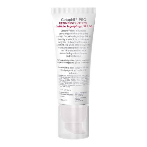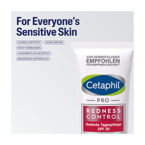 Die getönte Tagespflege ist Teil der dermatologischen Cetaphil PRO RednessControl Pflegeserie, die gezielt zur Behandlung von Symptomen der Rosazea (Gesichtsrötung, Juckreiz, stechende, brennende Haut) entwickelt wurde. Die getönte Tagespflege schützt empfindliche Rosazea-Haut mit Lichtschutzfaktor 30 vor UV-bedingter Gesichtsrötung. Die neutrale Tönung gleicht den Hautton aus und kaschiert Rötungen sofort. Gleichzeitig wird die trockene Haut sanft gepflegt und mit Allantoin und Süßholzwurzelextrakt beruhigt.