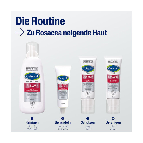 - Cetaphil PRO RednessControl Milder Reinigungsschaum (PZN 12477575): Die besonders sanfte Schaumtextur reinigt zu Rötungen neigende Haut mild und eignet sich als Vorbereitung für die Behandlung im Abschluss.