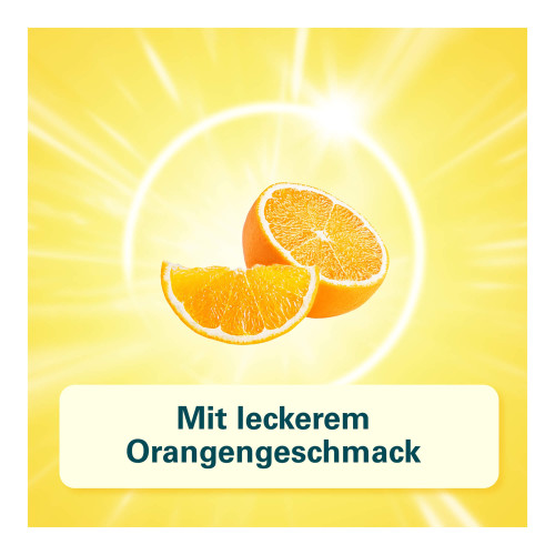 Natium-L-Ascorbat, L-Ascorbinsäure, Süßungsmittel: Sorbit, Aspartam, Acesulfam K, Neohesperidin DC, Natriumsaccharin; Trennmittel: Speisefettsäuren, Magnesiumsalze der Speisefettsäuren, Talkum, Cellulose; Stabilisatoren: Hydroxypropylmethylcellulose, Hydroxypropylcellulose; Orangenaroma, Farbstoffe: Titandioxid, Paprikaextrakt; Säureregulator: Äpfelsäure; mittelkettige Triglyceride.