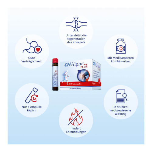 Da der Gelenkknorpel ein langsam wachsendes Gewebe ist, wird eine regelmäßige Einnahme über einen längeren Zeitraum (mindestens 3 Monate) empfohlen. Aufgrund der guten Verträglichkeit kann CH-Alpha® PLUS auch dauerhaft eingenommen werden.