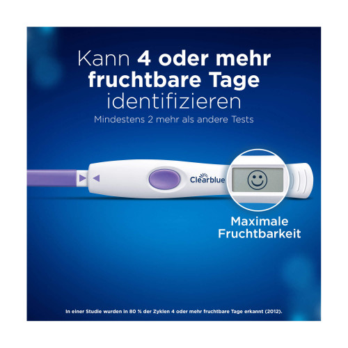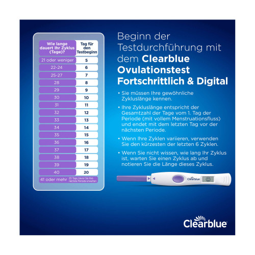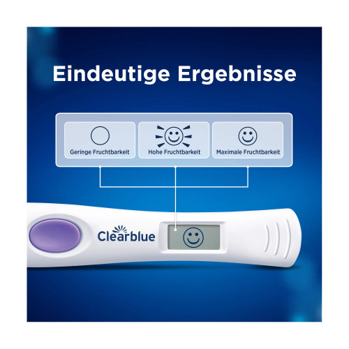 Eine Frau kann nur an wenigen Tagen in ihrem Zyklus schwanger werden. Daher sollte der Geschlechtsverkehr an diesen Tagen stattfinden, wenn ein Schwangerschaftswunsch besteht. Der Clearblue Ovulationstest Fortschrittlich & Digital ist der einzigeTest, mit dem Sie 4 fruchtbare Tage eines Zyklus ermitteln können. Bei diesem Test werden 2 wichtige Fruchtbarkeitshormone gemessen, um die Tage mit hoher und maximaler Fruchtbarkeit zu bestimmen. Damit können Sie genau planen und höhere Chancen auf eine Schwangerschaft erzielen.