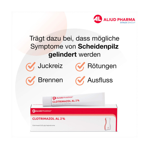 Clotrimazol AL 2 % Vaginalcreme. Anwendungsgebiete: Wird angewendet bei Ausfluss, bedingt durch Pilze (meist Candida), Entzündung der Scheide durch Pilze, Superinfektionen mit Clotrimazol-empfindlichen Bakterien. Warnhinweise: Enthält Benzylalkohol, Cetylstearylalkohol und Polysorbat.