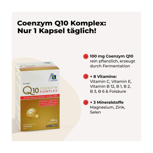 Nahrungsergänzungsmittel mit 100 mg rein pflanzlichem Coenzym Q10, Vitamin C und E sowie Zink und Selen zum Schutz der Zellen vor oxidativem Stress sowie Vitamin B12 und Magnesium zur Förderung der Zellteilung und für einen normalen Energiestoffwechsel.