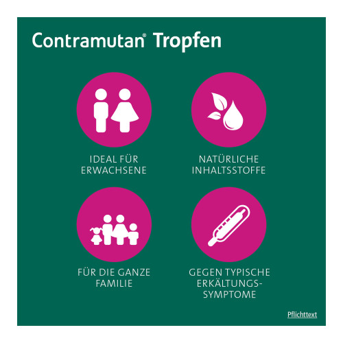 Contramutan Tropfen sind ein homöopathisches Arzneimittel bei entzündlichen Erkrankungen der oberen Luftwege. Die Anwendungsgebiete leiten sich von den homöopathischen Arzneimittelbildern ab. Dazu gehören: Fieberhafte, grippale Infekte mit Entzündungen der oberen Luftwege.