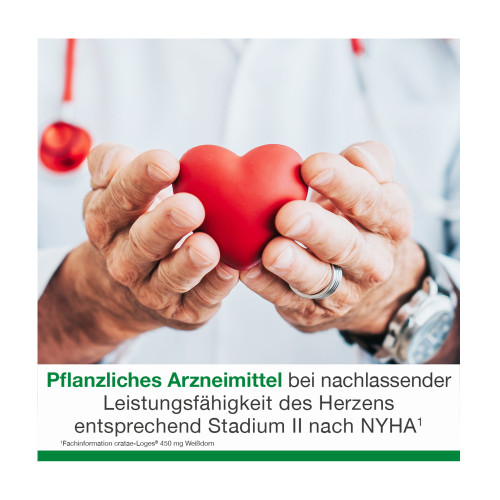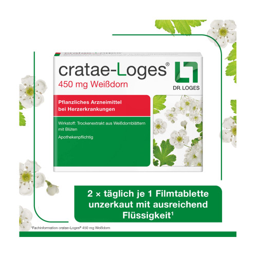 Cratae-Loges 450 mg Weißdorn Filmtabletten. Wirkstoff: Trockenextrakt aus Weißdornblättern mit Blüten. Anwendungsgebiete: Nachlassende Leistungsfähigkeit des Herzens entsprechend Stadium II nach NYHA.