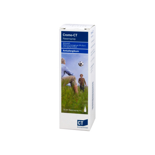 Cromo-CT Nasenspray. Wirkstoff: Natriumcromoglicat (Ph.Eur.). Anwendungsgebiete: Bei ganzjährigem allergischem Schnupfen (Rhinitis) und Heuschnupfen (saisonale allergische Rhinitis).