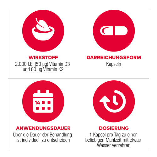 Die tägliche Einnahme von 1 Kapsel D3+K2 VIT AL kann zur täglichen Nahrungsergänzung ausreichend sein und einer Unterversorgung entgegenwirken. Zusätzlich enthält das Nahrungsergänzungsmittel Vitamin K2, das zur Aktivierung von Osteocalcin und damit zur Einbindung von Calcium in die Knochen beiträgt.