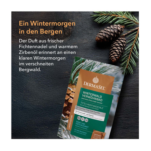 Der Spezialzusatz in DermaSel® WINTERWALD VERWÖHNBAD kombiniert diese Eigenschaften mit Fichtennadel- und Zirbenöl. Besonders ein Bad am Abend hilft, zu entschleunigen, zur Ruhe zu kommen und den Kopf zu befreien.