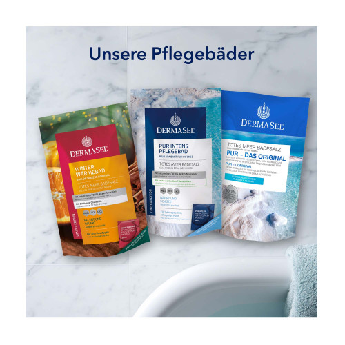 Das TOTES MEER Salz für die Badewanne. Schon in der Antike galt es als entspannend, gesundheitsfördernd und hilfreich bei verschiedensten Hautproblemen. DermaSel® TOTES MEER BADESALZ mit seinem hohen Gehalt an wertvollen Mineralien wie Kalium, Kalzium und Magnesium löst sanft verhornte Hautschuppen, pflegt und beruhigt die Haut.